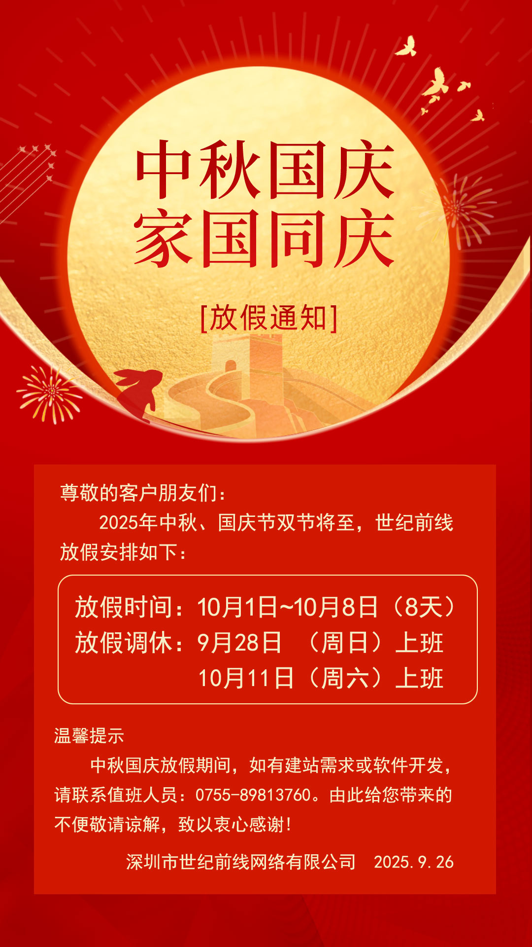 2025年中秋、国庆双节将至,世纪前线放假安排:2025.10.1~10.8(8天),10.9号正常上班。放假调休:9月28日(周日)、10月11日(周六)上班。